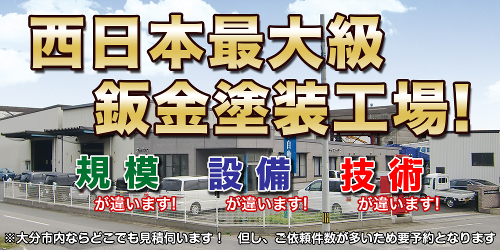 「自社工場で安心価格」 高いと思われがちな板金塗装。渋々保険で対応する人は少なくありません。しかし、そんな常識をくつがえしたのが西日本自動車グループです。ついつい付いてしまった指やコインでひっかいたような10センチほどのキズならば、なんと5,800円から修理可能です。 高いイメージでなかなか手が出なかった板金塗装も、もっと身近に、もっと気軽に修理に出して頂けます。このような破格で修理できるのには理由があります。実は西日本自動車グループには板金塗装の自社工場があるため、より低価格で施工が出来るのです。「より低価格で、より安心なサービスをお届け出来る様、今後より一層精進したい」と安心・低価格な板金塗装をおススメしています。